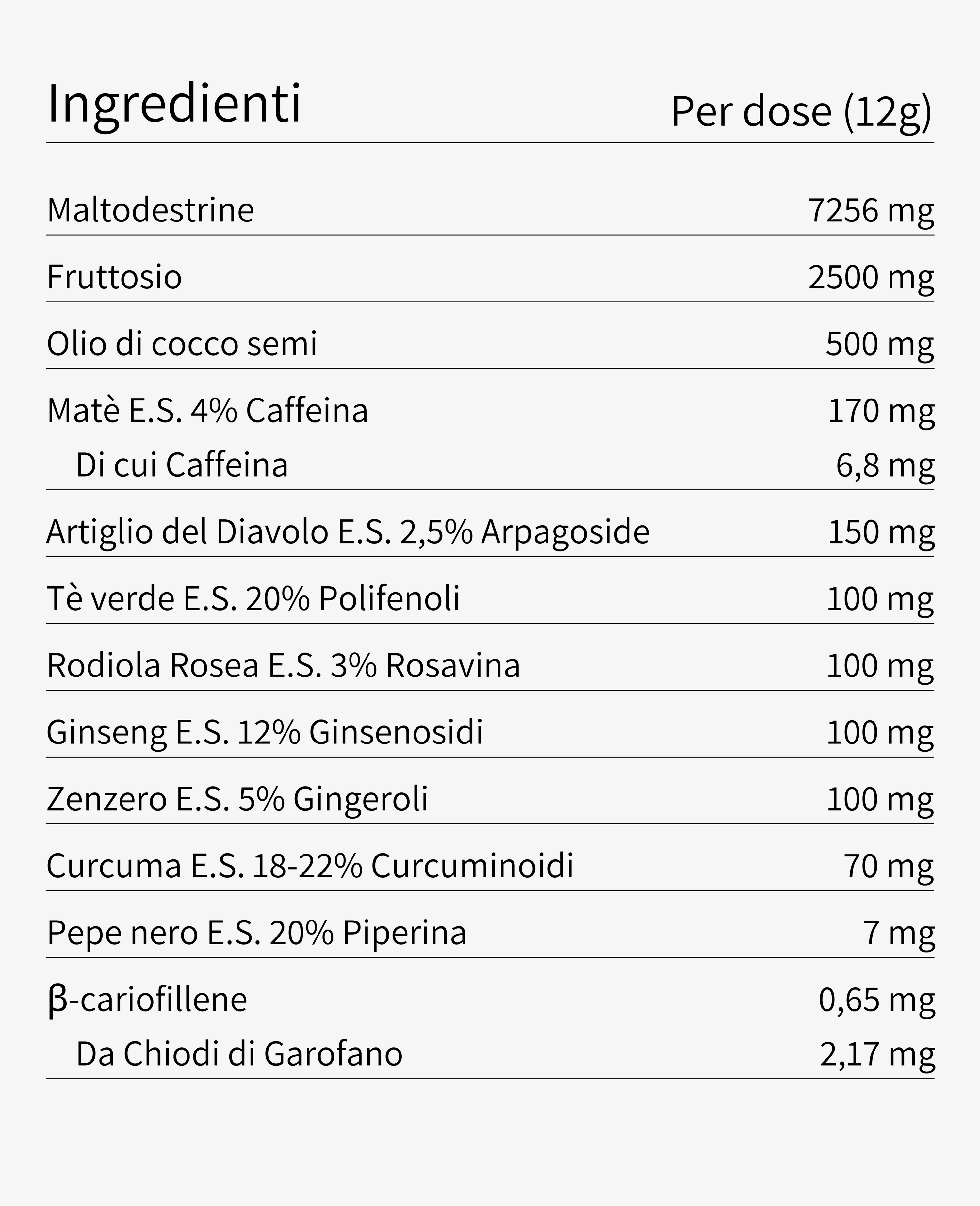 Integratore alimentare con zucchero ed edulcorante. A base di estrattivegetali con maltodestrine e fruttosio. Ingredienti:Maltodestrine; Fruttosio, Olio di cocco semi (Cocos nucifera L.); agente antiagglomerante: Biossido di silicio; emulsionante: Polisorbato 80; aroma, Matè foglie (Ilex paraguariensis A. St.-Hil.) estratto secco titolato al 4% in caffeina, Artiglio del diavolo radice (Harpagophytum procumbens (Burch.) DC. e Harpagophytum zeyheri Decne.) estratto secco titolato al 2,5% in arpagosidi; emulsionante: Esteri di saccarosio degli acidi grassi; Tè verde foglie (Camellia sinensis (L.) Kuntze) estratto secco titolato al 20% in polifenoli, Rodiola radice (Rhodiola rosea L.) estratto secco titolato al 3% su rosavina, Ginseng radice (Panax ginseng C.A. Mey.) estratto secco titolato al 12% in ginsenosidi, Zenzero rizoma (Zingiber officinale Rosc.) estratto secco titolato al 5% in gingeroli, Curcuma rizoma (Curcuma longa L.) estratto secco titolato al 18-22% in curcuminoidi; edulcorante: Sucralosio; Pepe nero frutto (Piper nigrum L.) estratto secco titolato al 20% in piperina, β-cariofillene da chiodi di garofano olio essenziale (Syzygium aromaticum (L.) Merr. Et L.M. Perry) 30% (con amido).